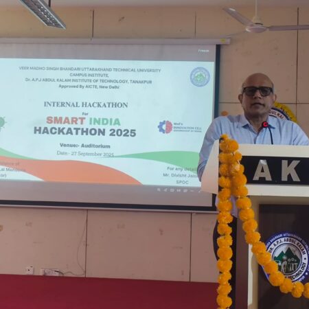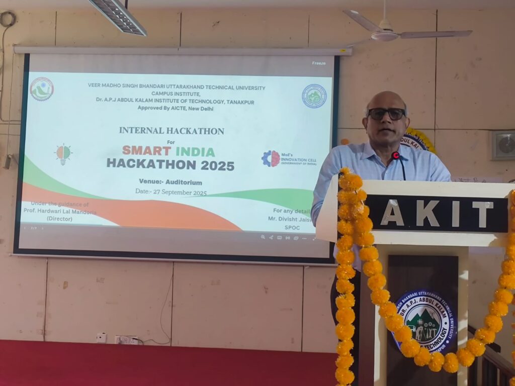 टनकपुर। डॉ. ए.पी.जे. अब्दुल कलाम प्रौद्योगिकी संस्थान, टनकपुर में आंतरिक स्मार्ट इंडिया हैकाथॉन 2025 का सफल आयोजन किया गया। यह आयोजन राष्ट्रीय स्तर पर होने वाले स्मार्ट इंडिया हैकाथॉन 2025 की चयन प्रक्रिया का एक महत्वपूर्ण चरण रहा, जिसमें संस्थान की कुल 12 टीमों ने भाग लिया। कार्यक्रम का शुभारंभ पारंपरिक दीप प्रज्वलन से हुआ जिसे संस्थान के निदेशक प्रो. हर्दवारी लाल मंडोरिया, रजिस्ट्रार डॉ. अभिषेक पाठक, डीन अकादमिक्स श्री लवजीत सिंह तथा हैकाथॉन के स्पोक एवं संयोजक श्री दिविष्ठ जायसवाल (सहायक प्राध्यापक, कंप्यूटर विज्ञान एवं अभियांत्रिकी विभाग) ने संयुक्त रूप से किया।